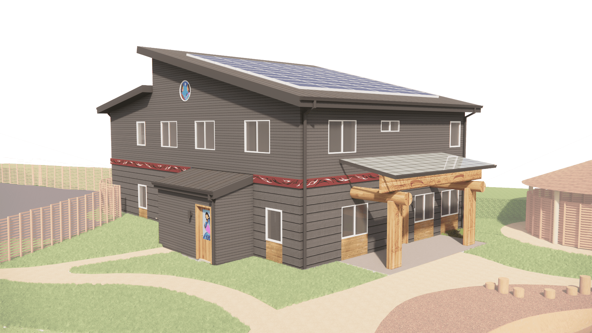 The design draws from Salish longhouse traditions while meeting modern needs. Each two-story, stepped-gable structure orients roofs for solar panels to achieve Net Zero energy. Durable, sustainable materials, such as structural insulated panels, cement plank siding, and heavy timber porches with carved cedar columns, reflect cultural heritage while ensuring longevity.